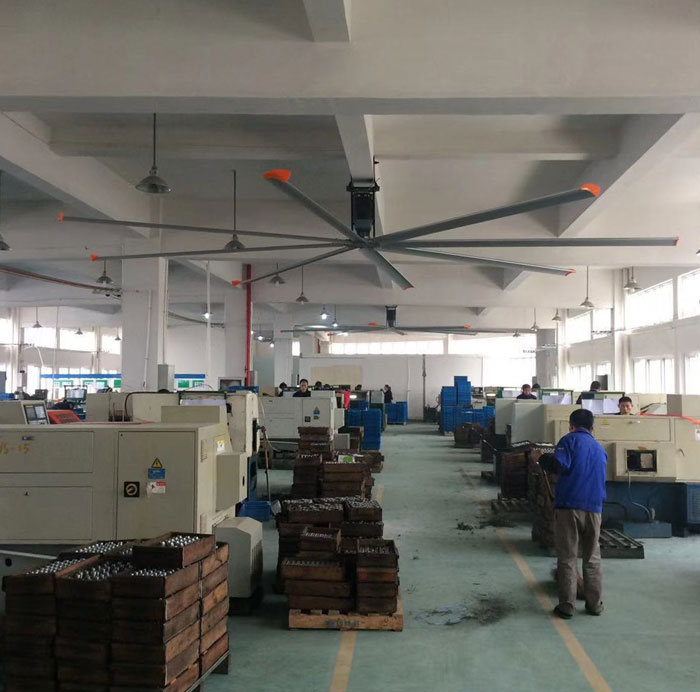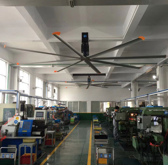 我公司生產(chǎn)的大型工業(yè)吊扇直接懸掛在廠房屋梁下,風力柔和,能加快車間空氣流通,有效降低車間內溫度,改善車間空氣環(huán)境質量,有利于員工的身體健康。
